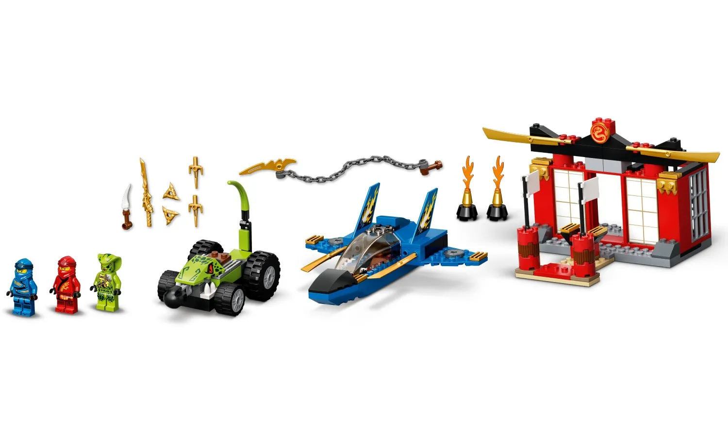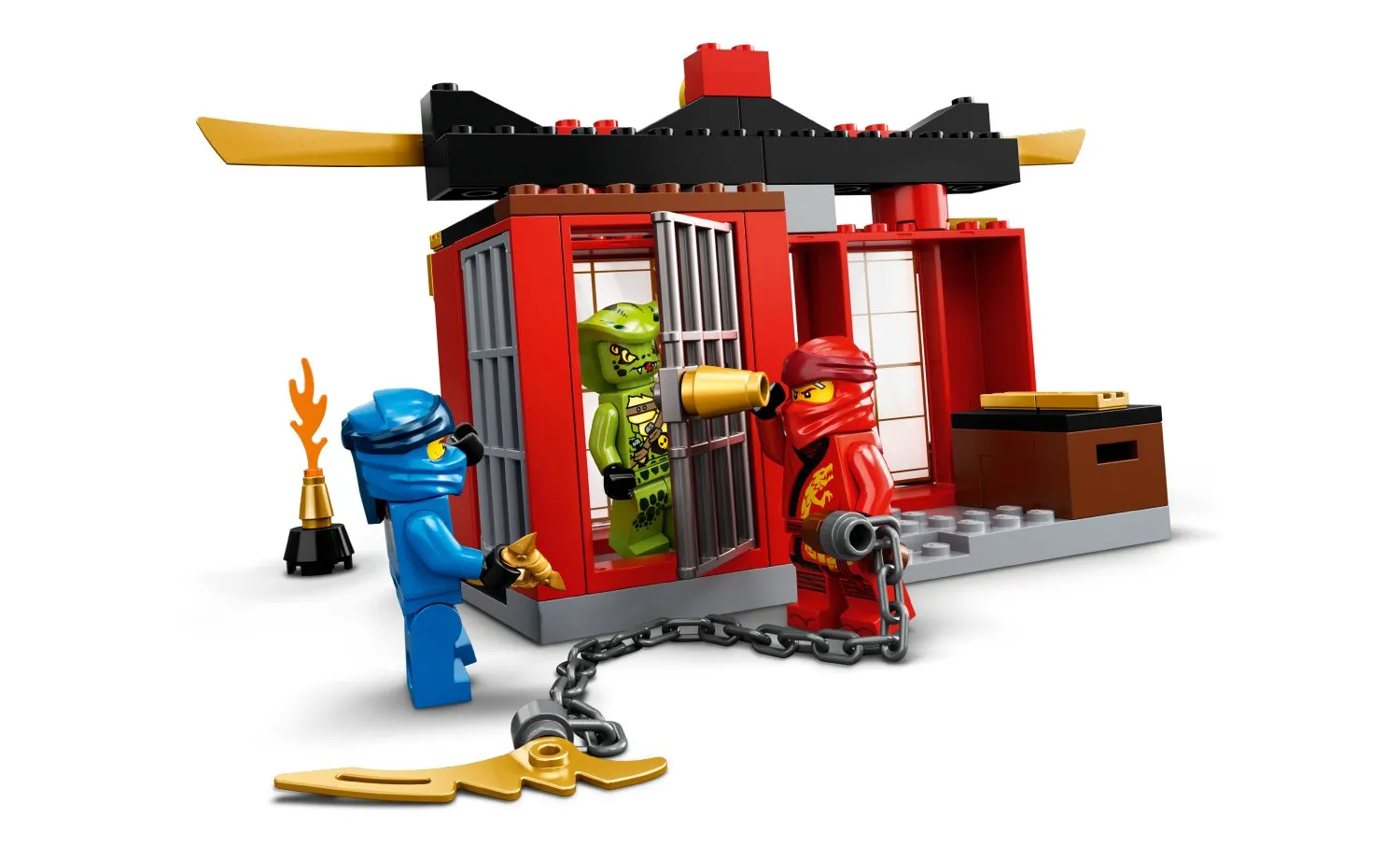 - Această jucărie distractivă include cărămizi speciale pentru a-I ajuta pe micuții ninja să construiască și să își creeze propriile aventuri NINJAGO cu minifigurinele Kai, Jay, Lasha, o mașină de jucărie, un avion de jucărie și un templu cu închisoare atașată.