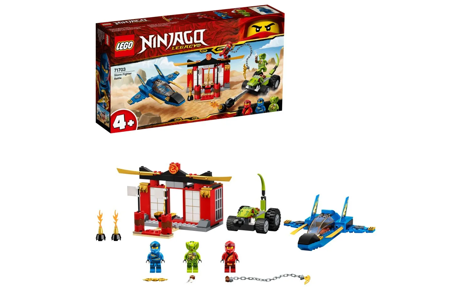 Copiii pot recrea scene palpitante din primele sezoane din serialul TV Maeștrii Spinjitzu cu acest set LEGO® NINJAGO® Legacy. Setul Întrecere cu avionul de luptă (71703) include 3 minifigurine, un avion de jucărie, o mașină de jucărie și un templu NINJAGO cu închisoare. Acest set de bătălie cu ninja le va oferi copiilor ore întregi de distracție creativă.
