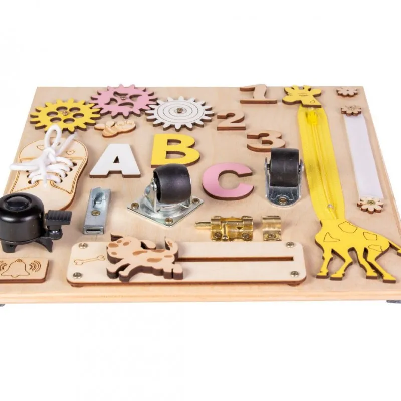 Tabla de dezvoltare este un loc de joacă tradițional pentru dezvoltarea timpurie a unui copil mic. Busy board a fost propus pentru prima dată de psihologul și educatorul italian Maria Montessori pentru dezvoltarea timpurie a copiilor. Busy board este unul dintre cele mai convenabile tipuri de jucării educaționale. Jocurile obișnuite cu Busy board dezvoltă abilități precum: coordonarea mișcărilor, abilități motorii fine, logică, memorie. Centrul de dezvoltare sub formă de tablă ocupată îl va ajuta pe copilul dvs. să facă primii pași în învățarea literelor, numerelor, culorilor și stăpânirii obiectelor de uz casnic.