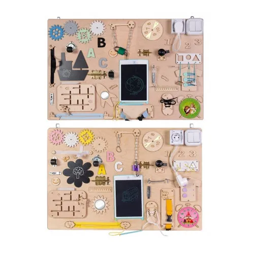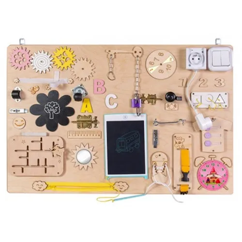 Tabla de dezvoltare este un loc de joacă tradițional pentru dezvoltarea timpurie a unui copil mic. Busy board a fost propus pentru prima dată de psihologul și educatorul italian Maria Montessori pentru dezvoltarea timpurie a copiilor. Busy board este unul dintre cele mai convenabile tipuri de jucării educaționale. Jocurile obișnuite cu Busy board dezvoltă abilități precum: coordonarea mișcărilor, abilități motorii fine, logică, memorie. Centrul de dezvoltare sub formă de tablă ocupată îl va ajuta pe copilul dvs. să facă primii pași în învățarea literelor, numerelor, culorilor și stăpânirii obiectelor de uz casnic.