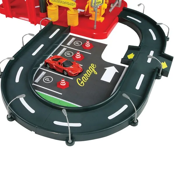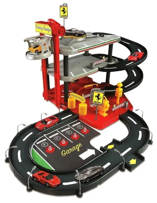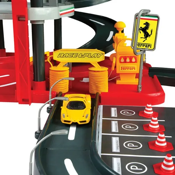 Set de joaca Garage Ferrari 18-31204 este o parcare pe trei nivele pentru copii cu 2 masini metalice, coborari, urcari, garaj, bariere, scara 1:43. Este realizat din plastic foarte rezistent, inodor, usor de asamblat (copilul se poate descurca fara ajutorul parintilor). Toate părțile de parcare sunt proiectate în așa fel încât să fie ușor și sigur conectate între ele și pot fi combinate cu alte parcări de către Bburago.