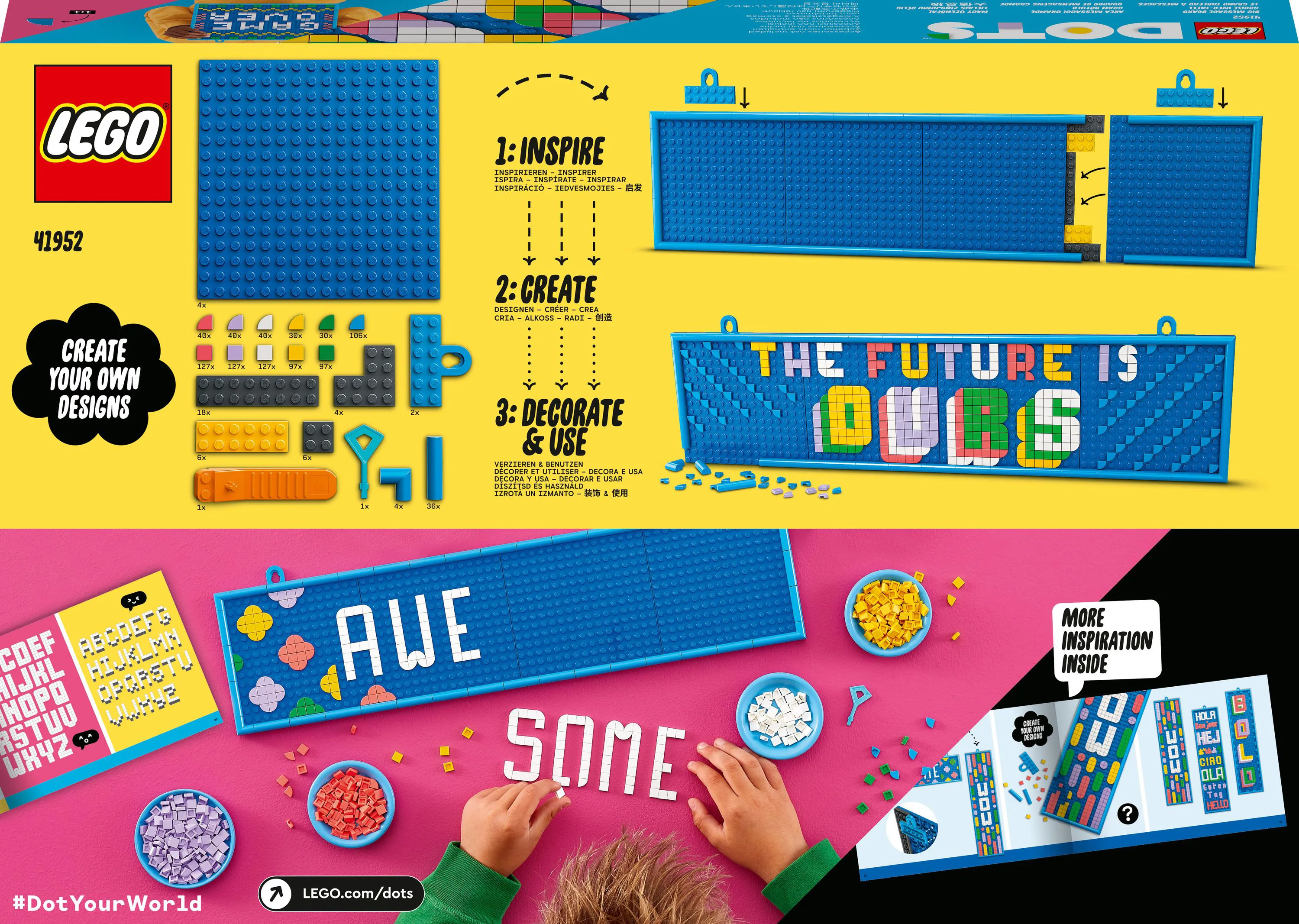 Copiii și fanii artelor și meșteșugurilor vor adora acest kit LEGO® DOTS Panou mare pentru mesaje (41952)! Conceput să încurajeze exprimarea de sine și creativitatea, setul oferă copiilor de 8 ani și mai mari ocazia de crea și a expune mesaje personalizabile pe care le pot schimba în funcție de dispoziție, pasiune sau decorul camerei lor.