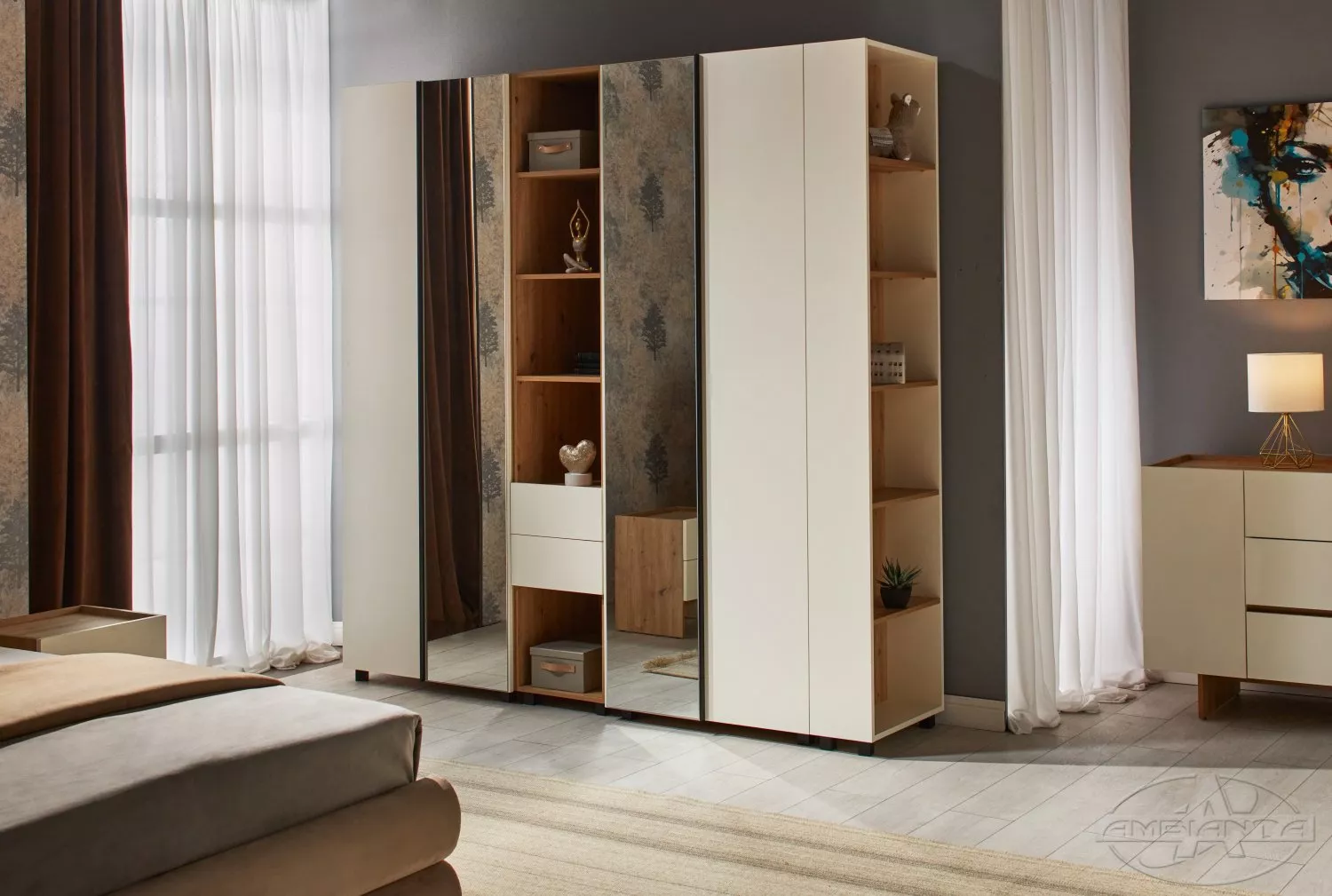 Dulap Ambianta Kosmo (80x52x224 cm) cu bara, usi combinate, Artisan/Crem