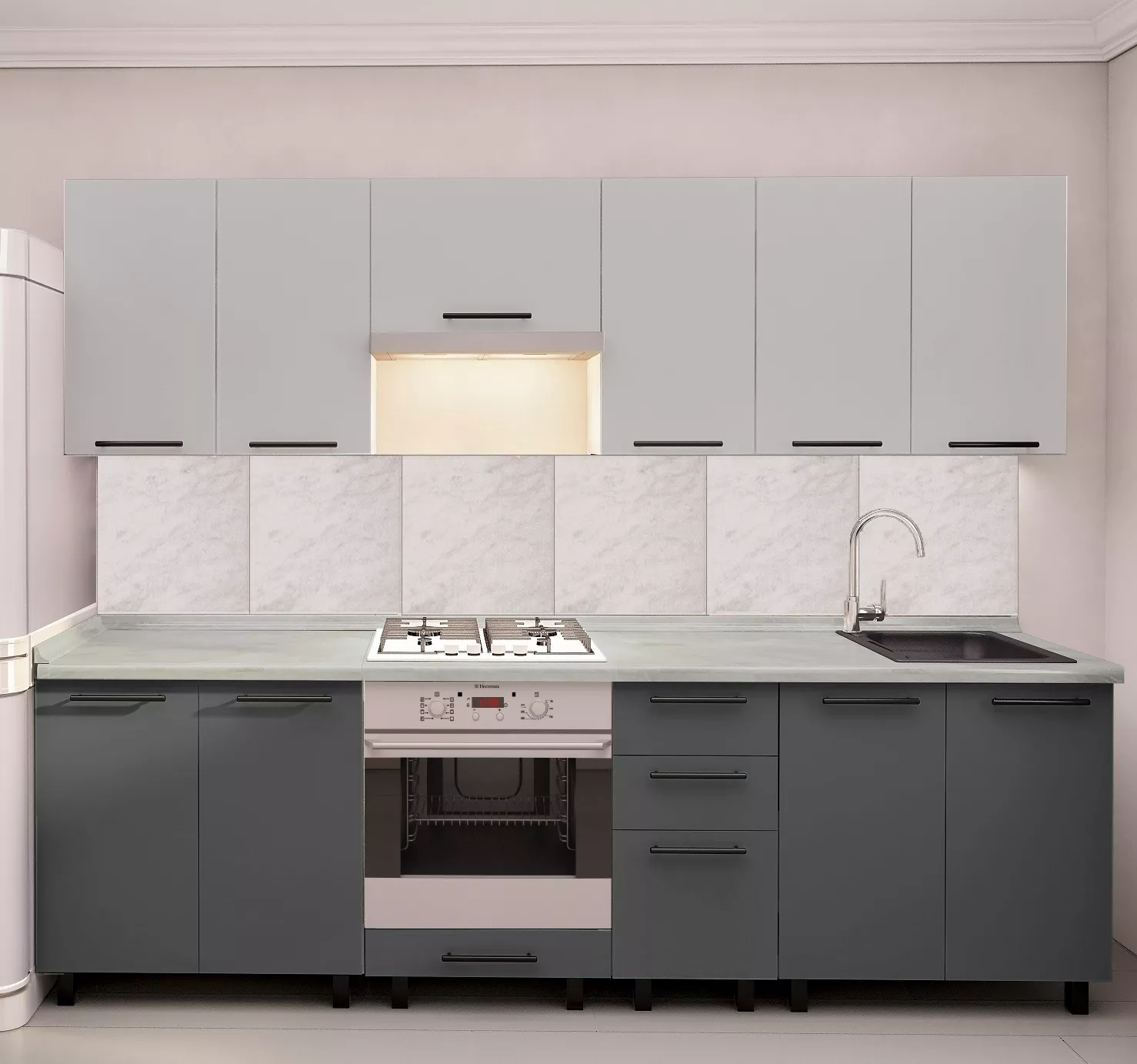 Bucatarie Bafimob Iulia 2.6 m, MDF vopsit, fațadă Neted, Gri deschis mat/Gri mat