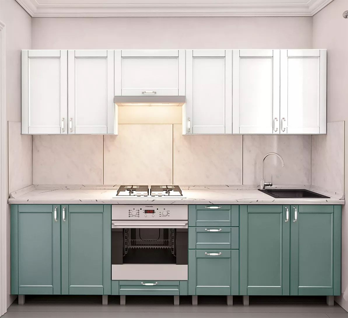 Bucatarie Bafimob Iulia 2.6 m, MDF vopsit, fațadă frezată Modern, Alb mat/Verde deschis mat