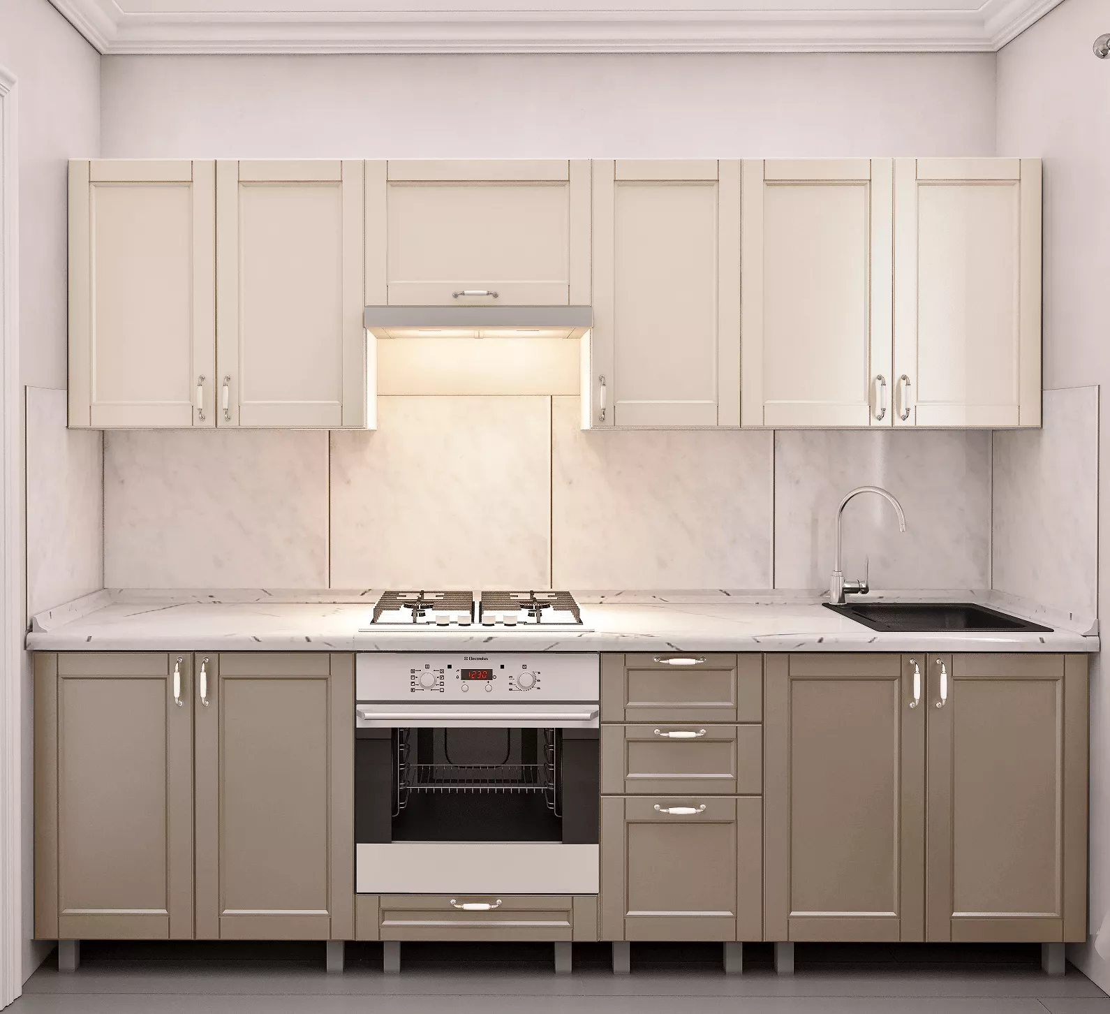 Bucatarie Bafimob Iulia 2.6 m, MDF vopsit, fațadă frezată Modern, Bej mat/Cappuccino mat