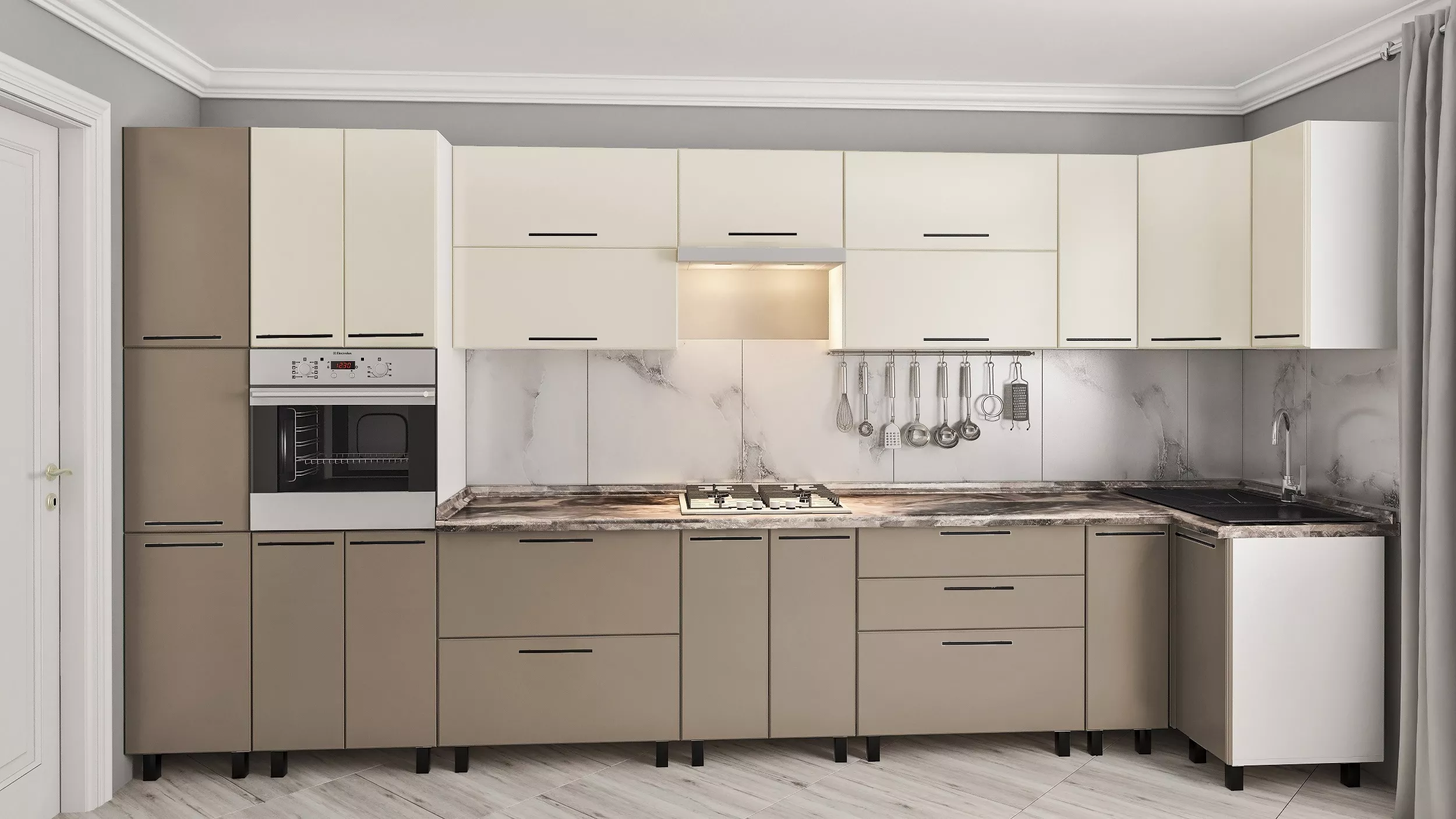 Bucatarie de colț Bafimob Eco 4,1х0,9 m, MDF vopsit, fațadă Neted, Bej mat/Cappuccino mat