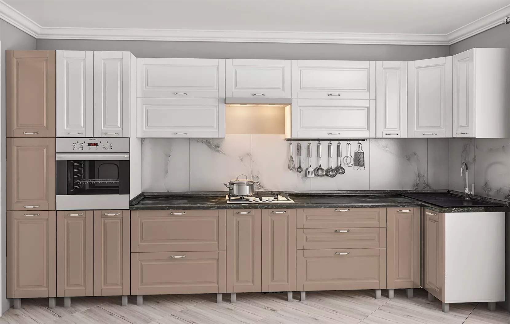 Bucatarie de colț Bafimob Eco 4,1х0,9 m, MDF vopsit, fațadă frezată Clasic, Alb mat/Cappuccino mat