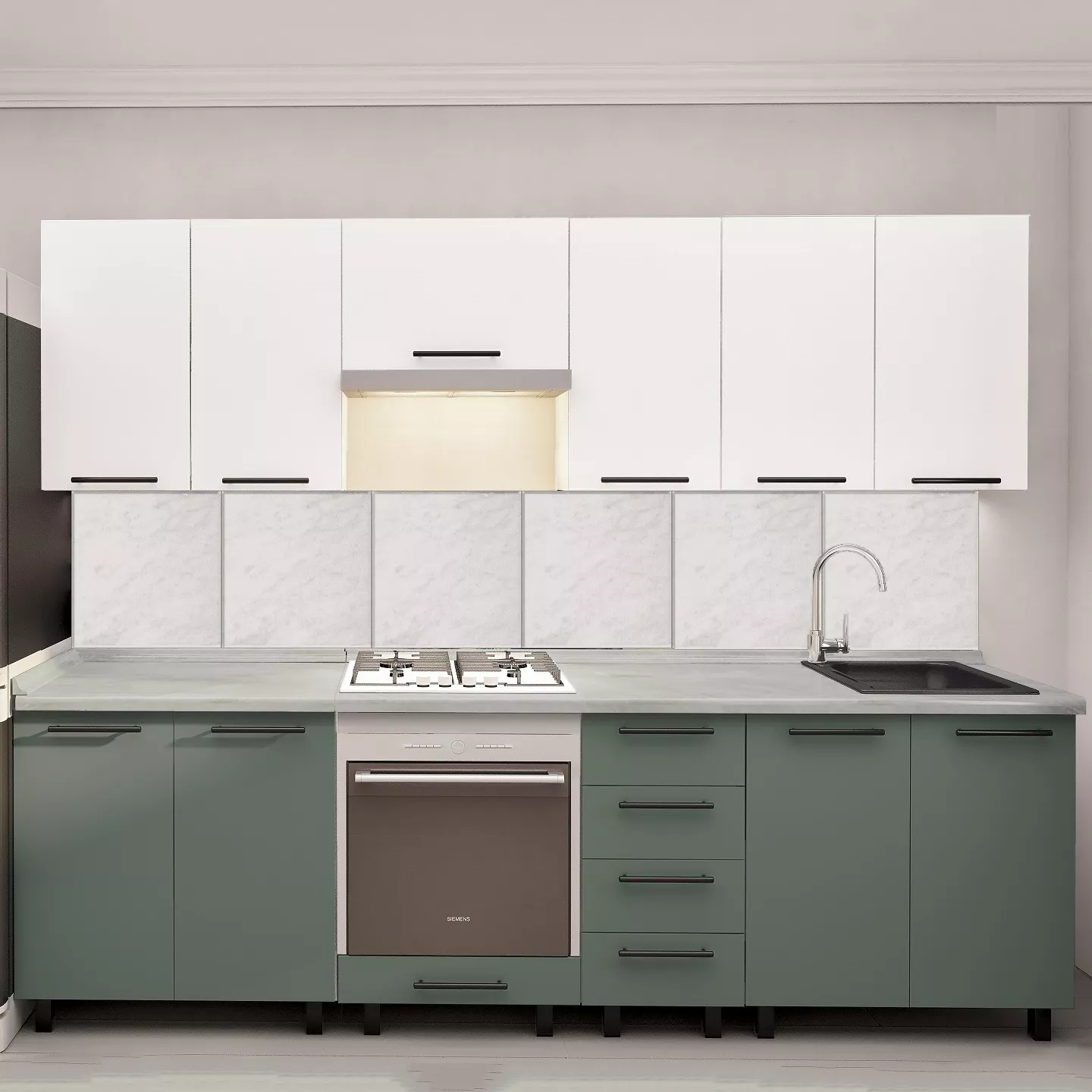 Bucatarie Bafimob Iulia 2.6 m, MDF, cu fatade din panouri mate AGT (Trendy Panel) Alb mat (734 White)/Verde deschis mat (735 Relax Green)