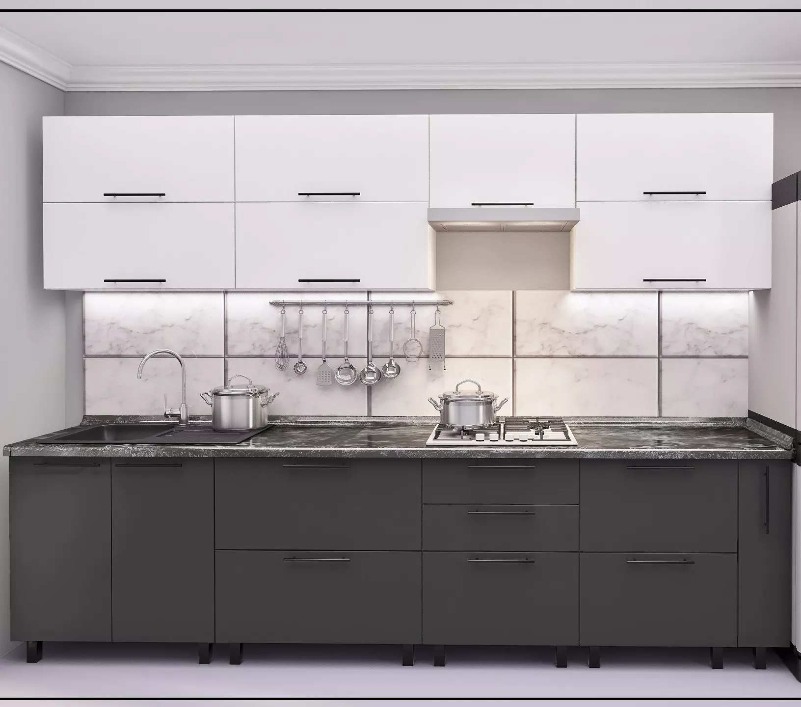 Bucatarie Bafimob Quadro 3.0 m, MDF, cu fatade din panouri mate AGT (Trendy Panel) Alb mat (734 White)/Gri mat (726 Storm Grey)