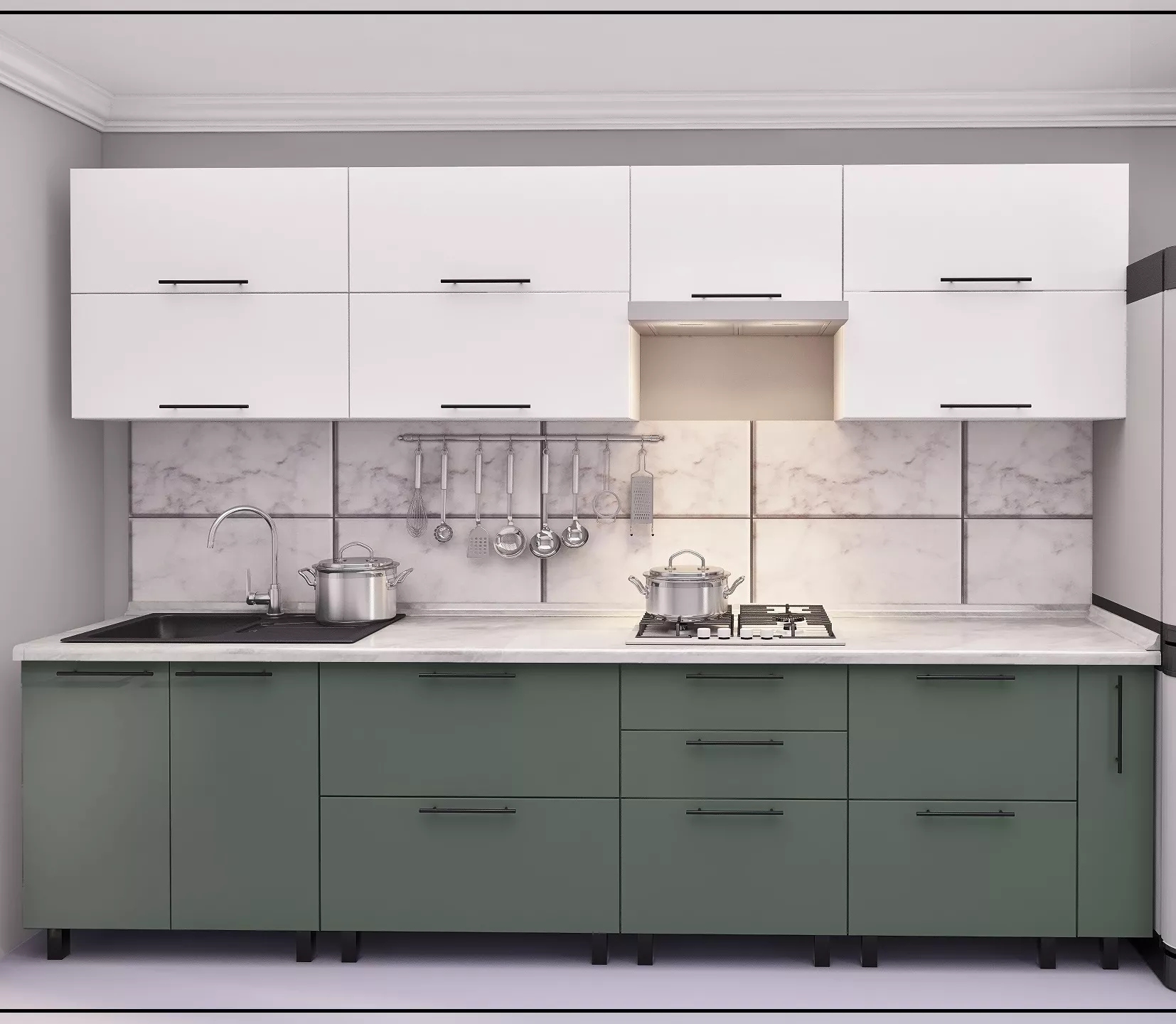 Bucatarie Bafimob Quadro 3.0 m, MDF, cu fatade din panouri mate AGT (Trendy Panel) Alb mat (734 White)/Verde deschis mat (735 Relax Green)