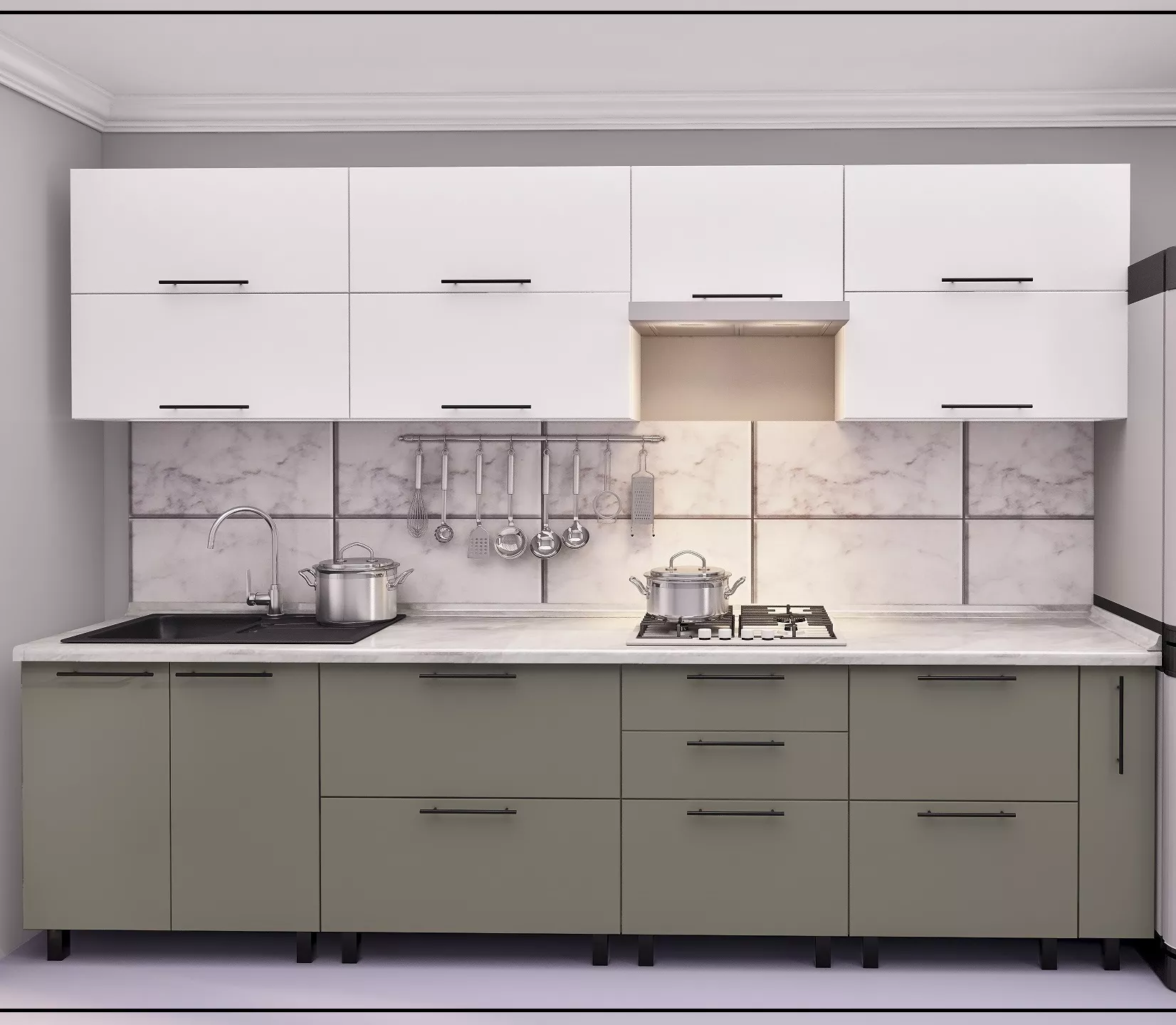 Bucatarie Bafimob Quadro 3.0 m, MDF, cu fatade din panouri mate AGT (Trendy Panel) Alb mat (734 White)/Cappuccino mat (729 New Grey)