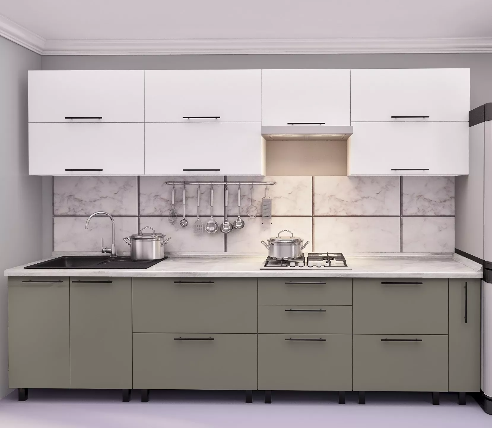 Bucatarie Bafimob Quadro 3.0 m, MDF vopsit, fațadă Neted, Alb mat/Cappuccino mat