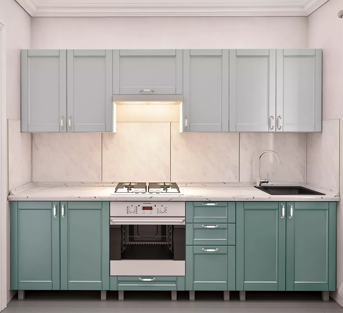 Bucatarie Bafimob Iulia 2.6 m, MDF vopsit, fațadă frezată Modern, Gri deschis mat/Verde deschis mat