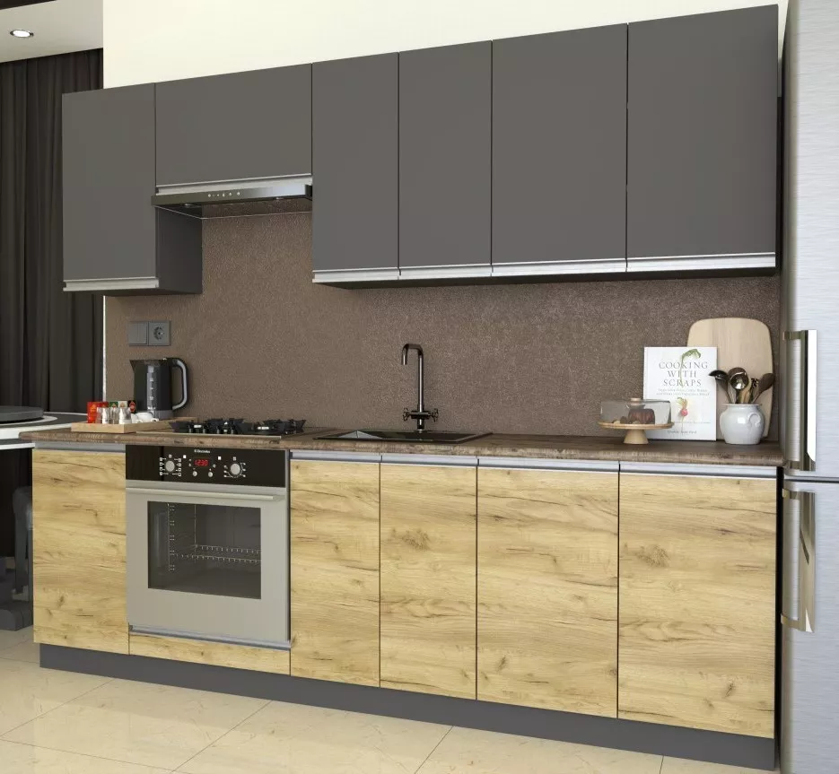 Bucatarie Yasen Madera 2.4 m, PAL, Grafit Gri / Stejar Kraft Auriu