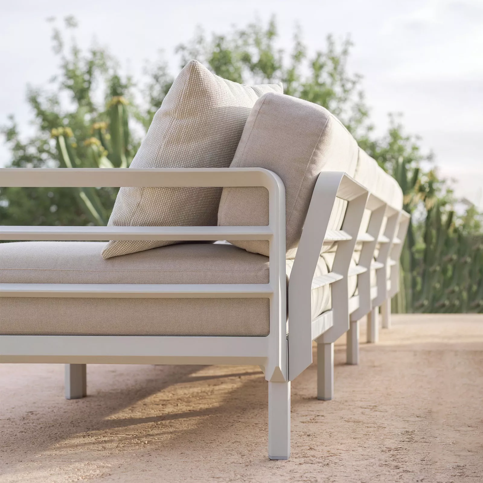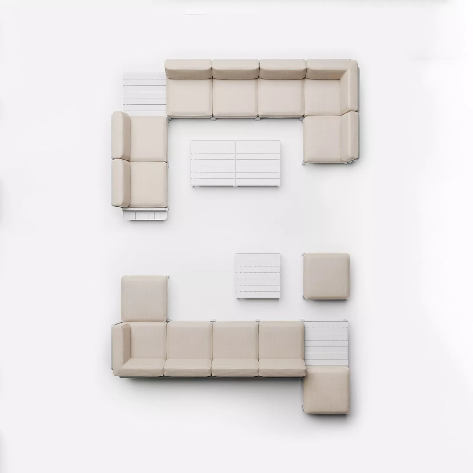Design rafinat, plăcut din punct de vedere estetic: liniile curate și echilibrate se dezvoltă pe orizontală, creând un sentiment de profunzime și lungime; Structura din plastic reciclat este solidă și durabilă, dar ușoară vizual, cu secțiuni triunghiulare modulare și detalii rotunjite. Volume mari, scaun confortabil, adânc și modularitate flexibilă, armonioasă.