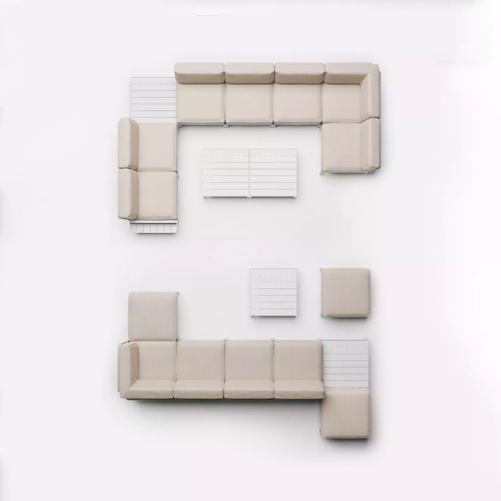 Design rafinat, plăcut din punct de vedere estetic: liniile curate și echilibrate se dezvoltă pe orizontală, creând un sentiment de profunzime și lungime; Structura din plastic reciclat este solidă și durabilă, dar ușoară vizual, cu secțiuni triunghiulare modulare și detalii rotunjite. Volume mari, scaun confortabil, adânc și modularitate flexibilă, armonioasă.