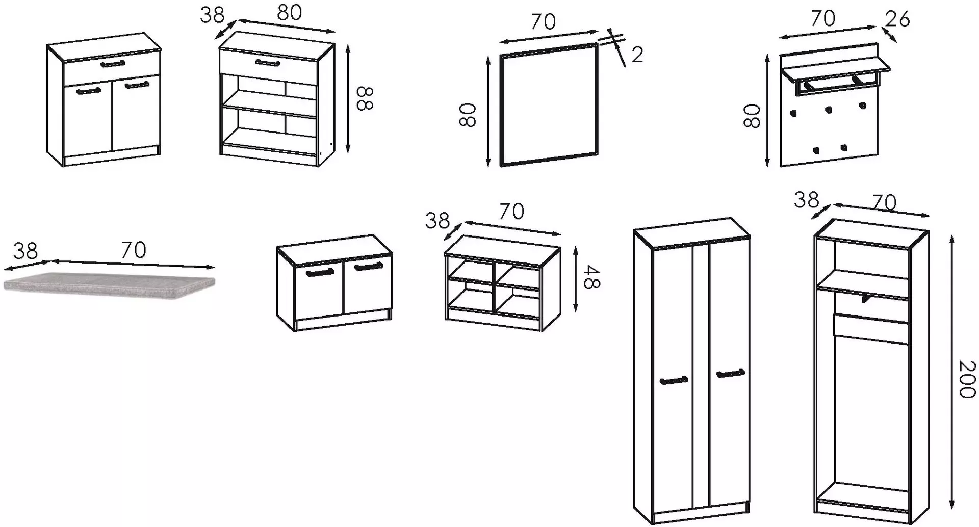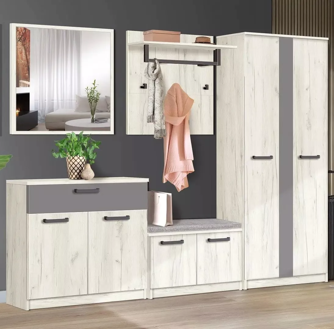 | Setul conține | Dulap: 700х2000х380 mm, Tumba-bancheta: 700х480х380 mm, Tumba: 800х880х380 mm, Cuier: 700х800х260 mm, Oglinda: 700х800х20 mm |