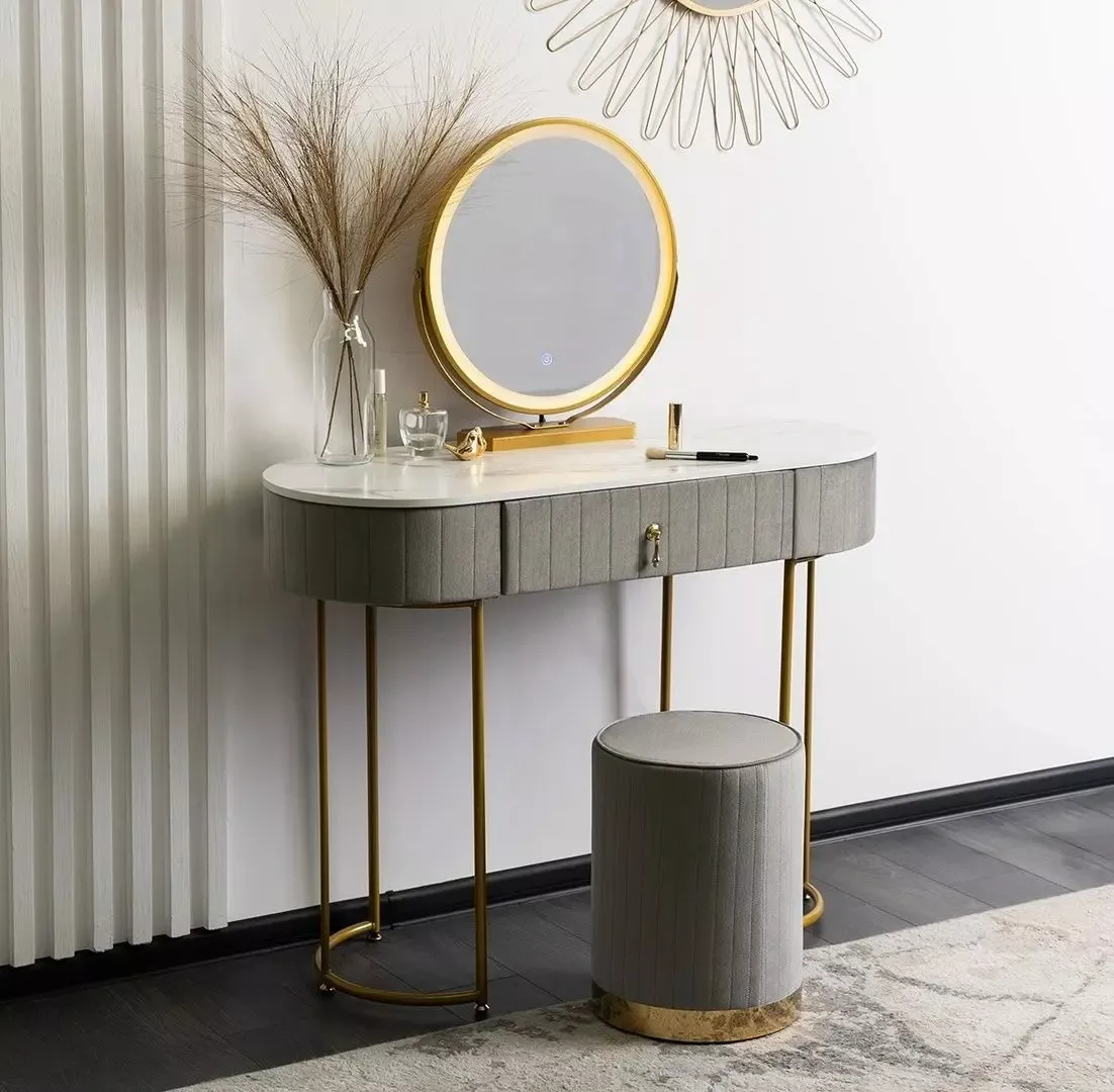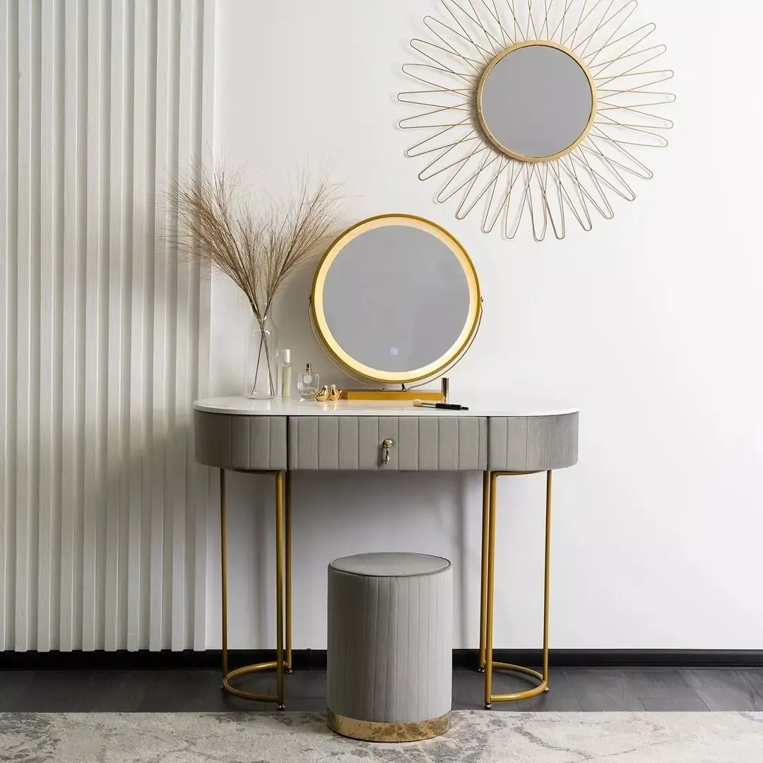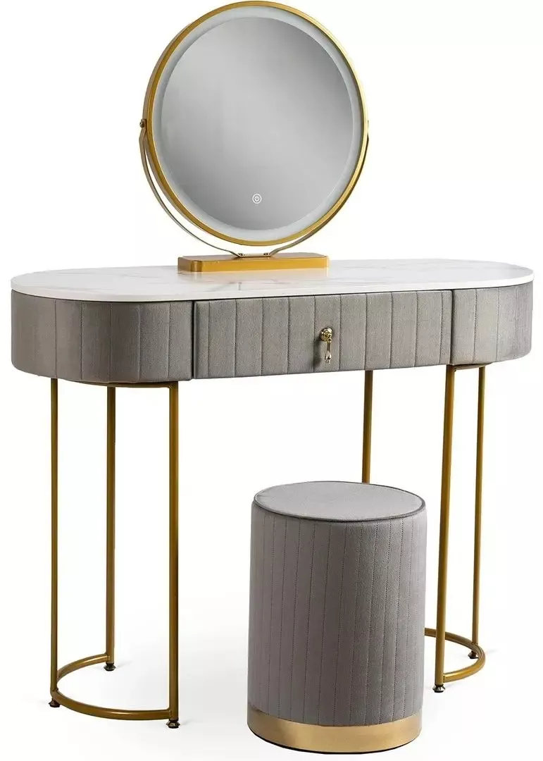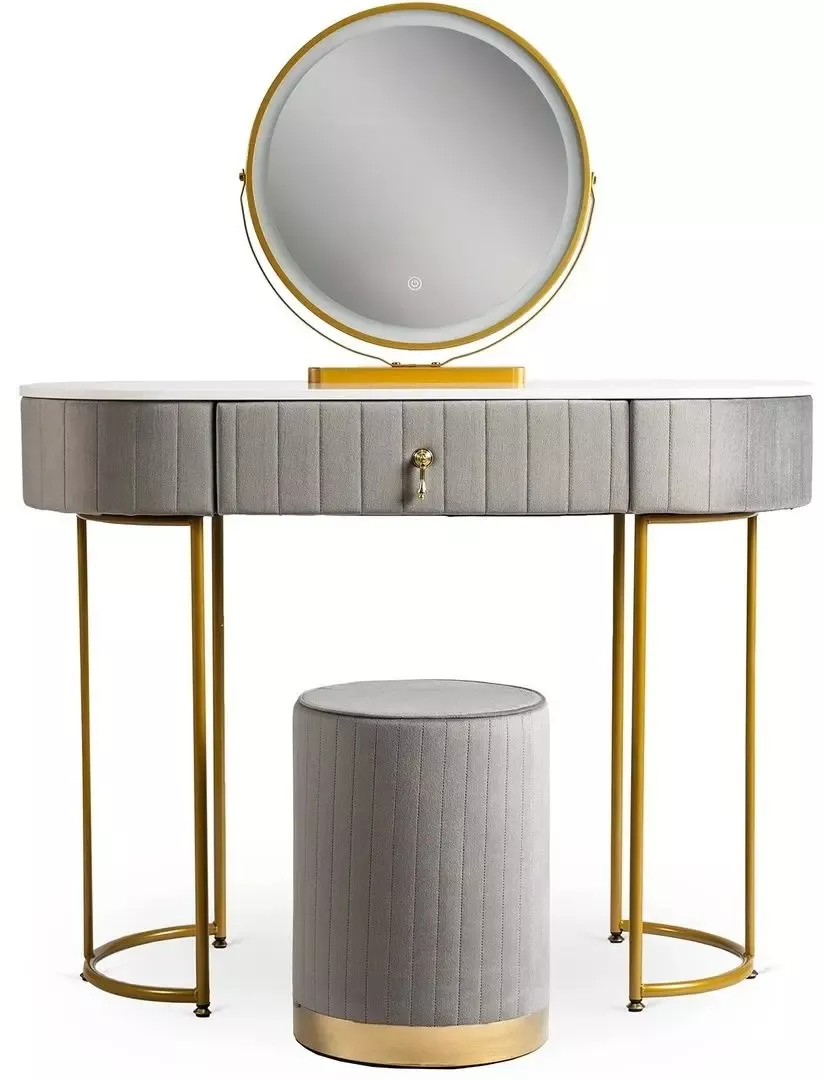 Masă toaletă Mebel Elite Ashley cu oglinda si puf, Grey/Golden