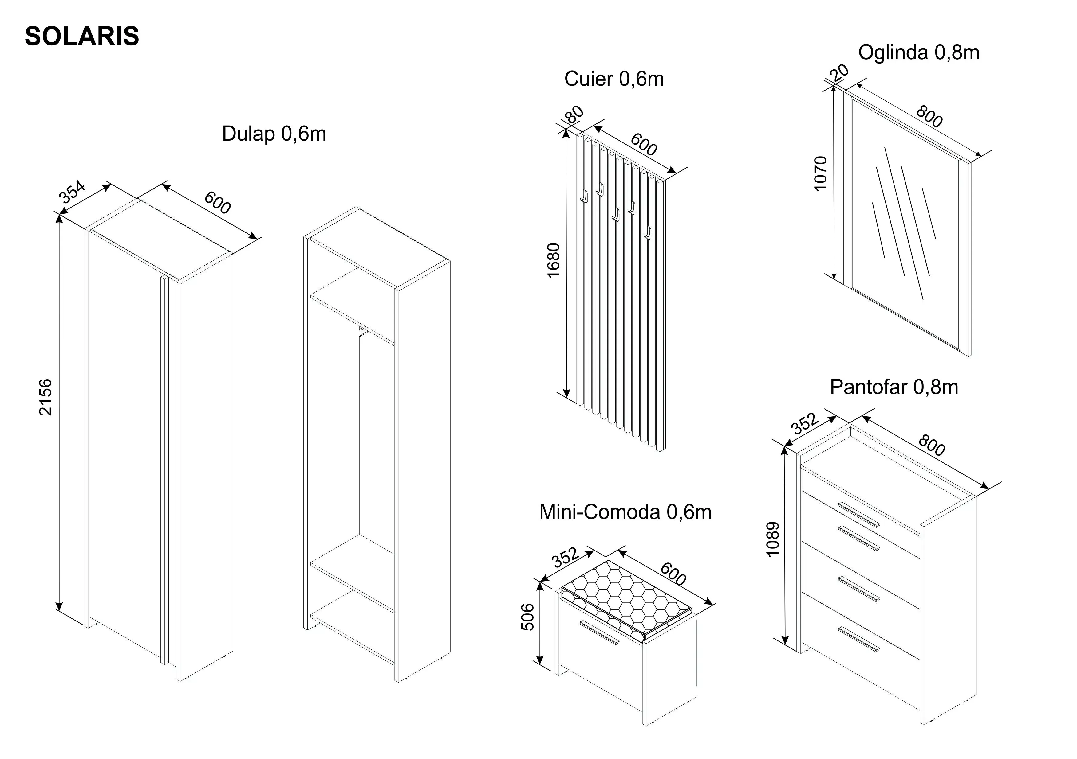 | Setul conține | cuier, oglinda, pantofar, Dulap, mini-comoda |
