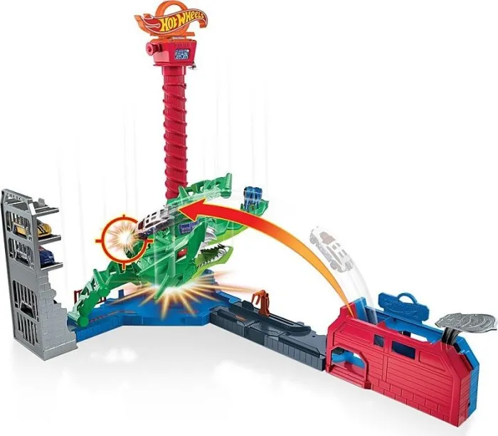 Игровой набор Воздушная атака дракона-робота Hot Wheels Сити, фирмы Mattel (Маттел). Встречайте мощный моторизованный игровой набор с огромным драконом! Победите его, и город будет спасен! Кнопка на башне активирует гигантского дракона-робота: он “парит” над отделением полиции, и того и гляди выпустит всех преступников на свободу! Запускайте Hot Wheels машинки в его слабое место, блок питания, расположенный между крыльями, чтобы повергнуть грозного противника. Не теряйте ни секунды!