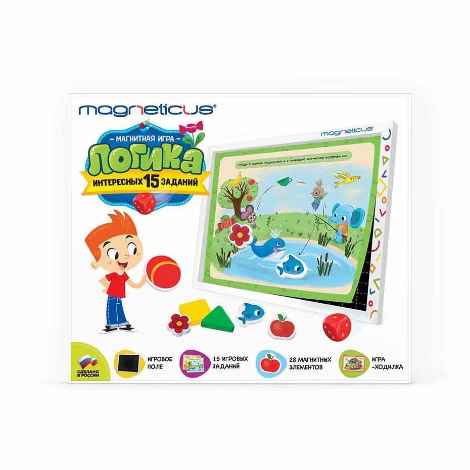 Развивающий набор «Логика» от компании «Magneticus» представлен комплектом магнитных элементов и специальным встроенным в упаковку полем, на котором можно выполнять задания на развитие логического мышления или играть в увлекательную игру-ходилку. Ребенок весело и с пользой проведет свой досуг, приобретая новые знания и навыки.