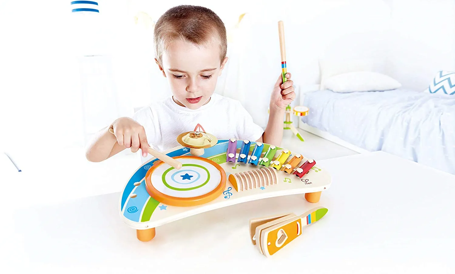 Вы станете целой группой из одного человека с этим удивительным мультиинструментальным столом. Включает барабан, ксилофон, тарелку, скретч-доску, трещотку и две палочки.