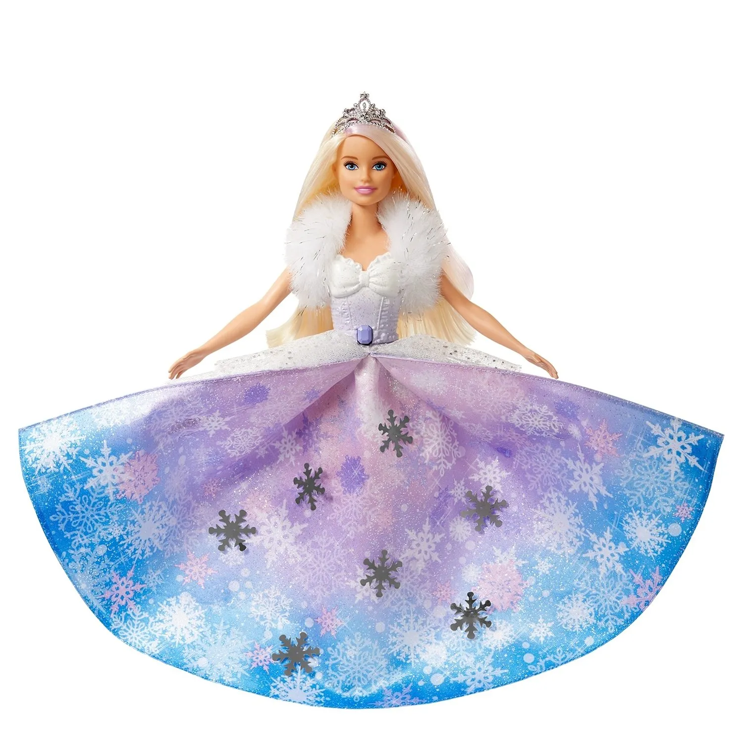 Нажмите кнопку на лифе куклы Barbie - и платье распахнется, раскрывая юбку с оттенками лавандового, голубого и розового цветов, а также серебристые снежинки!