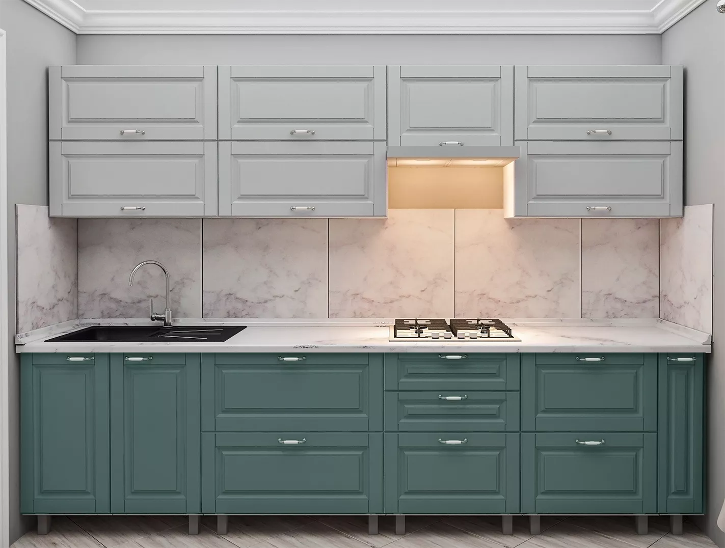 Кухня Bafimob Квадро 3.0 м, МДФ крашенный, фасад Классик, Светло серый-матовый/Салатовый-матовый
